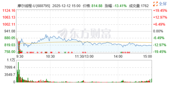 从市场表现看,在上市后的6个交易日里,相较发行价,摩尔线程股价期间最高涨幅723.49%,股价一度触及941.08元/股,对应总市值曾突破4400亿元。12月12日当天,此前股价连续大涨的摩尔线程迎来大幅回调,一度重挫逾19%,后跌幅有所收窄,最终报收814.88元/股,跌13.41%,累计涨幅仍超过613%。